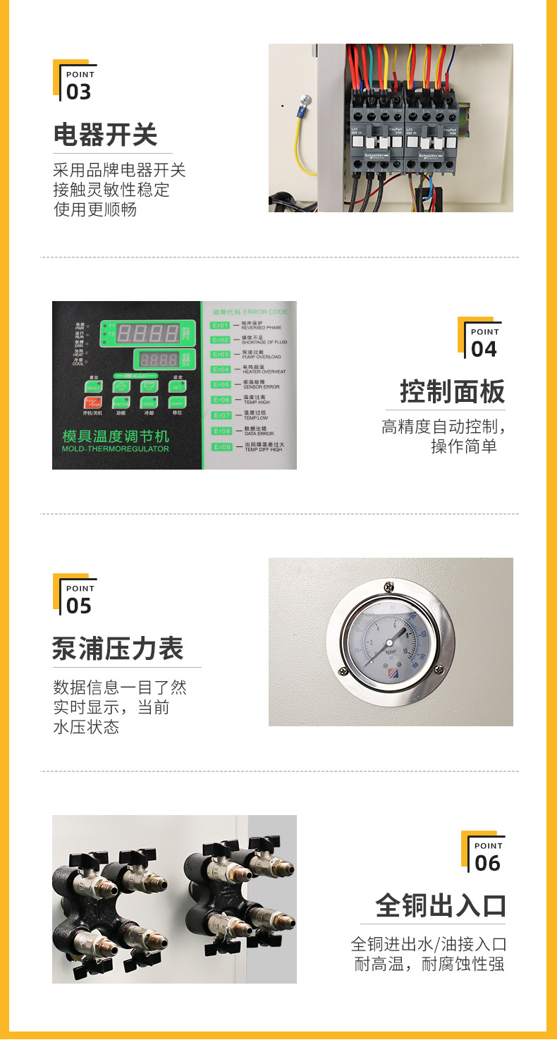 自動模溫機(jī)的用途:塑料有熱脹冷縮的物理性質(zhì),因此若模具溫度不穩(wěn)定或控溫不準(zhǔn)確,會導(dǎo)*成型品夾水紋、縮水、歪曲、變形及表面光澤不良等現(xiàn)象。自動模溫機(jī),正是因解決此類難題而特別設(shè)計(jì)制造的。自動模溫是利用熱交換原理,機(jī)內(nèi)的發(fā)熱器及冷卻器通過微電腦的設(shè)定和監(jiān)測,可準(zhǔn)確地調(diào)節(jié)水或熱媒油的溫度,并快速循環(huán)于模具加熱升溫或降溫,使模具在成型的時(shí)間內(nèi)得以保持穩(wěn)定的適當(dāng)溫度,確保成型的高品質(zhì),提高生產(chǎn)效率及節(jié)省電費(fèi)。